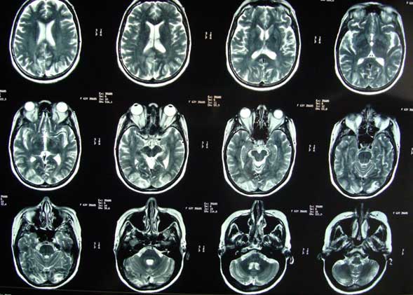 SPECT axial interictal: hemiatrofia hemisférica izquierda (síndrome de la triple H: hemiatrofia, hemiparesia, hemicrisis). Hipometabolismo en hemisferio izquierdo (mismo caso).